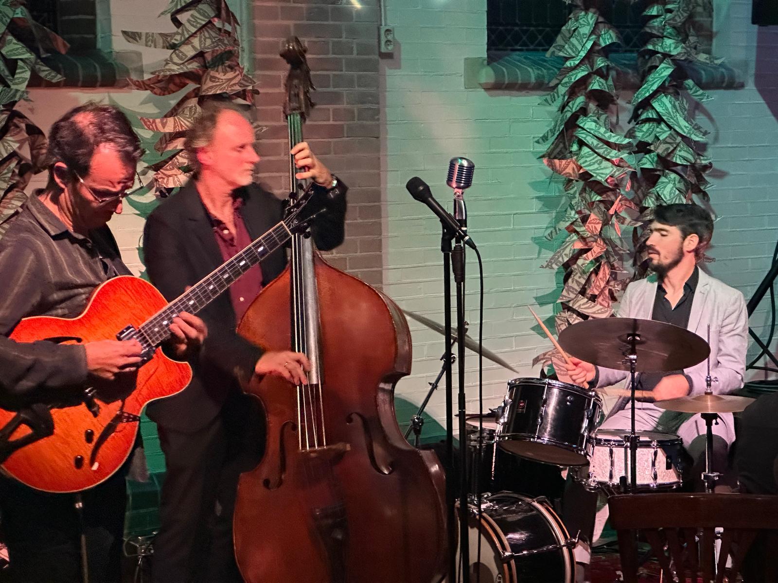 Het Wispe Trio Een thuiswedstrijd voor dit Weesper trio! Gitaarvirtuoos Jesse van Ruller – de eerste Europeaan die de prestigieuze Thelonious Monk International Jazz Guitar Competition won – vormde samen met Thomas Winther Andersen (bas) en Efraim Schulz-Wackerbarth (drums) een magisch trio. Jesse’s solo-intro van ‘Norwegian Wood’ en Efraim’s virtuoze handpercussie waren hoogtepunten. Special guest Maartje Meijer verraste met haar prachtige zang. DJ Patrick Meijer wijdde ons nieuwe dansvloertje in! Musicoloog Rik Spann vertelde ons over het belang ‘generous listening’… hoe je als publiek, door stilte te creeeren en aandachtig te luisteren mooie dingen tevoorschijn kunt toveren. Deze wijsheid staat sindsdien in onze club bekend als “De Eerste Wet Van Rik Spann”